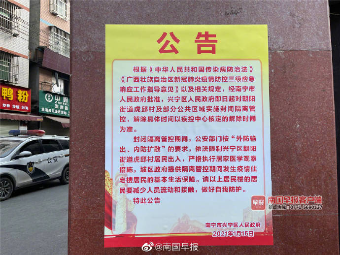 1月15日,南宁市兴宁区人民政府发布公告,根据《中华人民共和国传染病防治法》《广西壮族自治区新冠肺炎疫情防控三级应急响应工作指导意见》以及相关规定,经南宁市人民政府批准,兴宁区人民政府即日起,对朝阳街道虎邱村及部分公共区域实施封闭隔离管控,解除具体时间以疾控中心核定的解除时间为准。