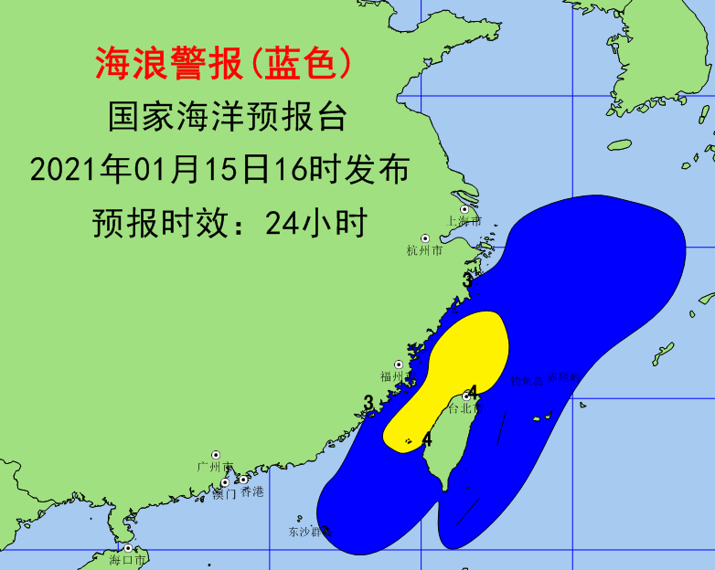 受冷空气的影响,预计1月16日白天,东海、钓鱼岛附近海域、台湾海峡将出现3到4.5米的大浪到巨浪区;浙江、福建近岸海域将出现2到3米的中浪到大浪。海浪预警级别为蓝色。