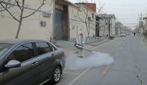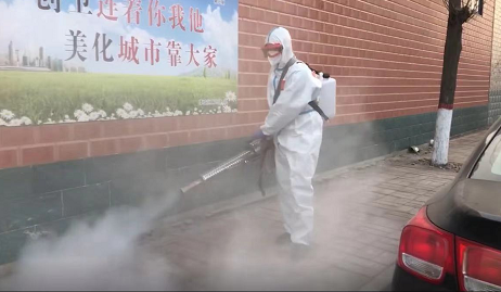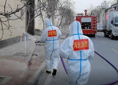 在消杀现场,来自石家庄市消防救援支队藁城大队的消防指战员身着最严防护装备,背负喷雾水枪等设备,按照任务分工对公共区域、设施进行全方位、全覆盖的消杀。