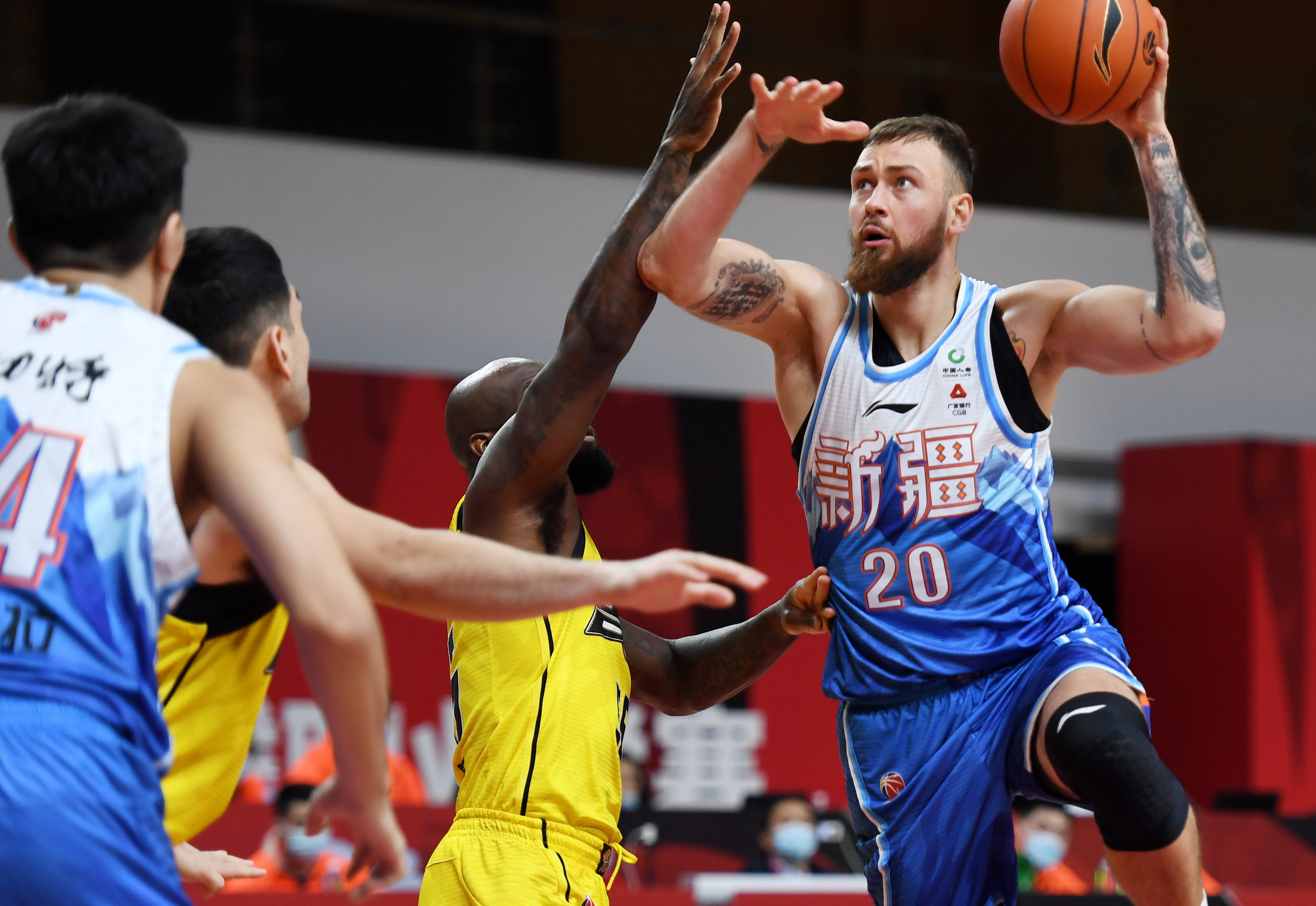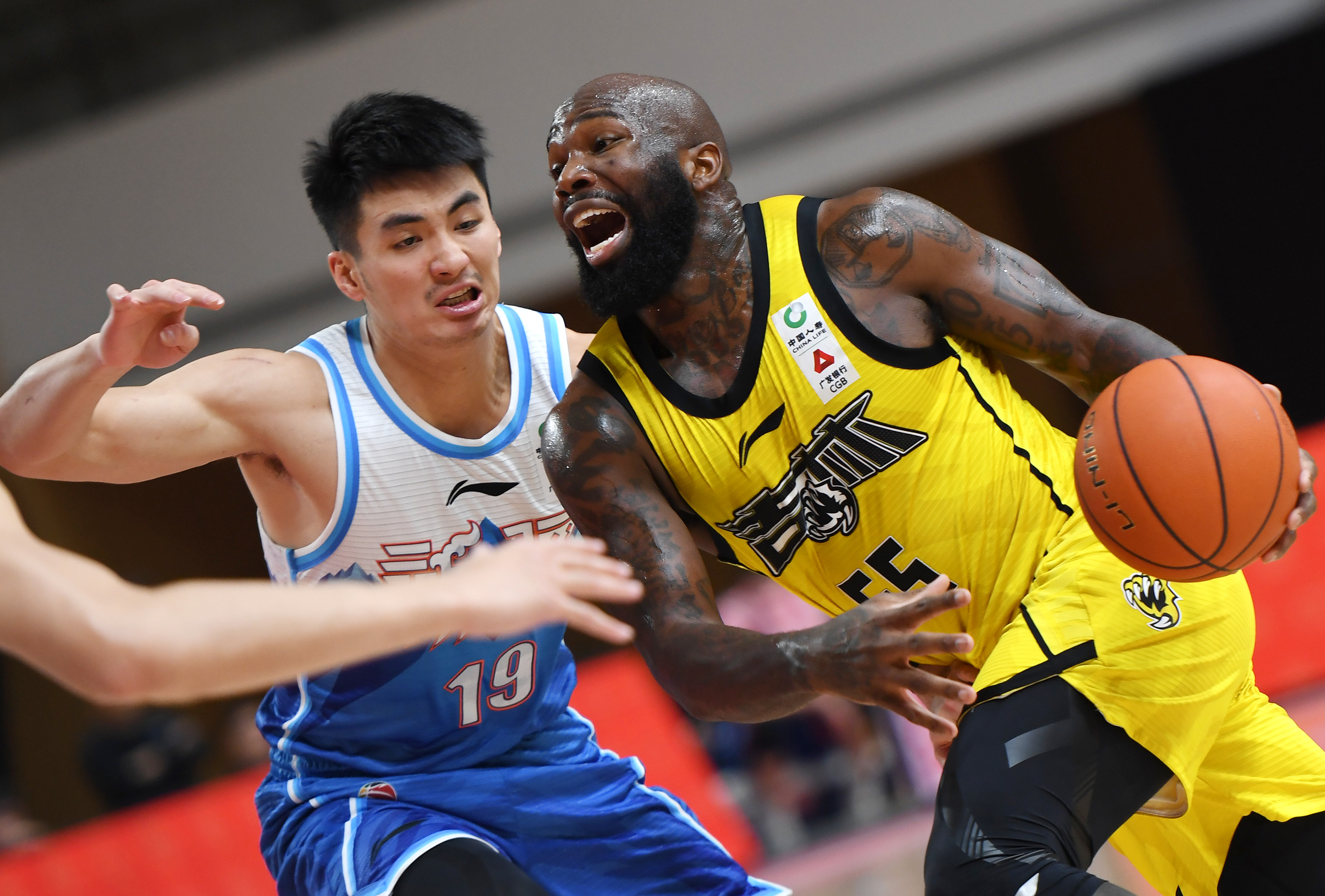 新疆伊力特队球员莫泰尤纳斯(右)上篮。新华社记者李紫恒摄