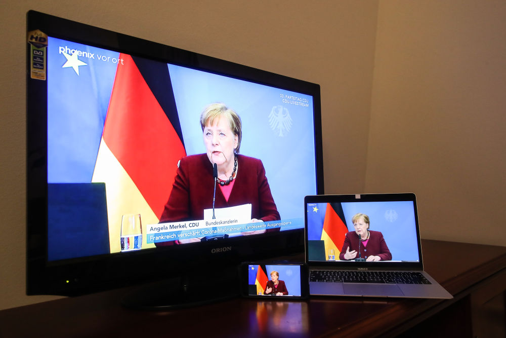 这是1月15日在德国首都柏林拍摄的德国总理默克尔在基督教民主联盟(基民盟)线上党代会致辞的视频直播画面。(新华社记者单宇琦摄)