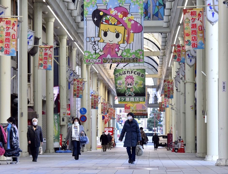 1月13日,在日本岐阜县岐阜市,佩戴口罩的行人走在一条商业街上。(新华社/共同社)