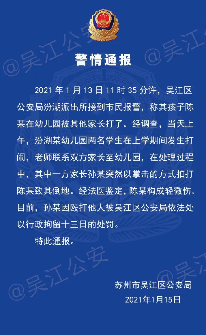 通报称,2021年1月13日11时35分许,吴江区公安局汾湖派出所接到市民报警,称其孩子陈某在幼儿园被其他家长打了。经调查,汾湖某幼儿园两名学生在上学期间发生打闹,老师联系双方家长至幼儿园,在处理过程中,其中一方家长孙某突然以掌击的方式拍打陈某致其倒地。经法医鉴定,陈某构成轻微伤。目前,孙某因殴打他人被吴江区公安局依法处以行政拘留十三日的处罚。