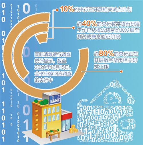 近日,国际清算银行调查统计显示,截至2020年12月15日,全球66家回应调查的央行中,约80%的央行正在开展数字货币相关研发工作,其中半数央行同时进行批发型和零售型数字货币研发工作(前者主要用于银行及其他相关机构间的巨额货币交易,后者用于满足公众日常消费需求)。约40%的央行,如日本、瑞士等国的数字货币研发工作已从概念研究阶段发展至测试或概念验证阶段;还有10%的央行,如法国、瑞典、新加坡、泰国等国央行已开展相关试点计划。