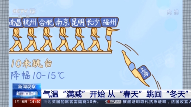 本周三开始,我国中东部开启了大回暖过程,尤其是在黄淮到江南一带,三九天里暖得堪比常年3月甚至4月。这种不合时宜的暖,往往意味着气温“满减”又要开始了。14日,中央气象台发布了寒潮蓝色预警,新疆南疆西部、山西中南部、东北地区东部以及云南东部、贵州大部和江南西南部等地降温10℃~12℃,局地可达12℃以上。气温跳水大赛拉开帷幕。