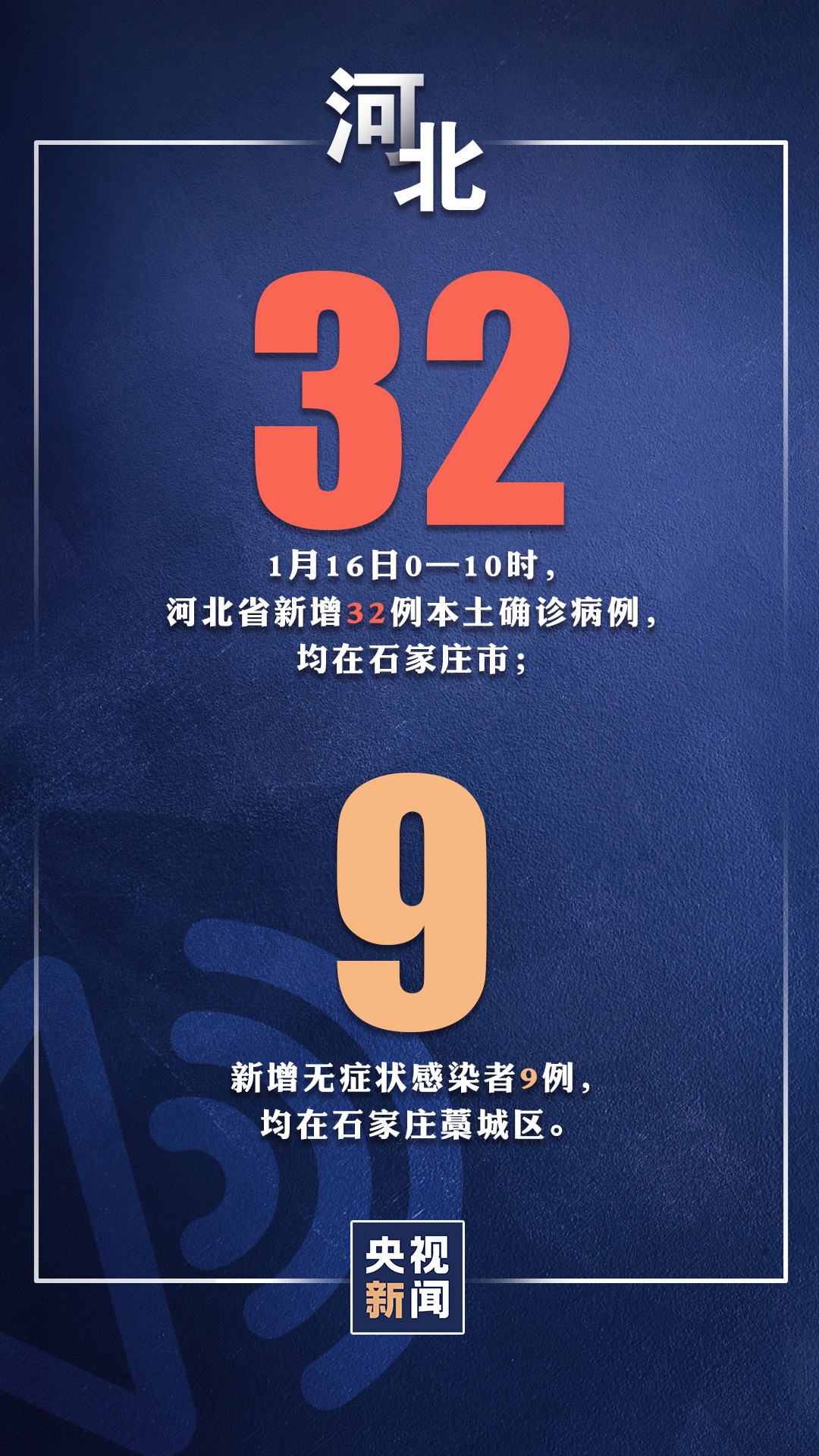1月16日0-10时,河北省新增32例本土确诊病例,均在石家庄市;新增无症状感染者9例,均在石家庄藁城区。1月2日至1月16日10点,河北省累计报告本土确诊病例688例,其中石家庄646例、邢台41例、廊坊1例。