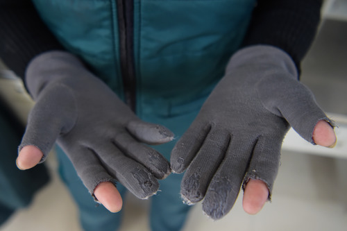 “我把手套剪了两个洞,看起来像‘破’手套,但能快速操作电子设备,提高送货效率。”韩金花说,剪的时候觉得是去年才买的,还有点舍不得。然而,这副去年买的手套现有多处磨出了线头。