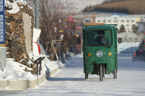 现在的内蒙古阿尔山市最高气温低至零下约28摄氏度。投递员韩金花从邮递三轮车上拿下一件包裹,踩着雪小步快跑地进入一家商铺。