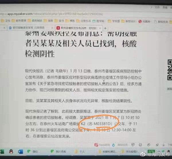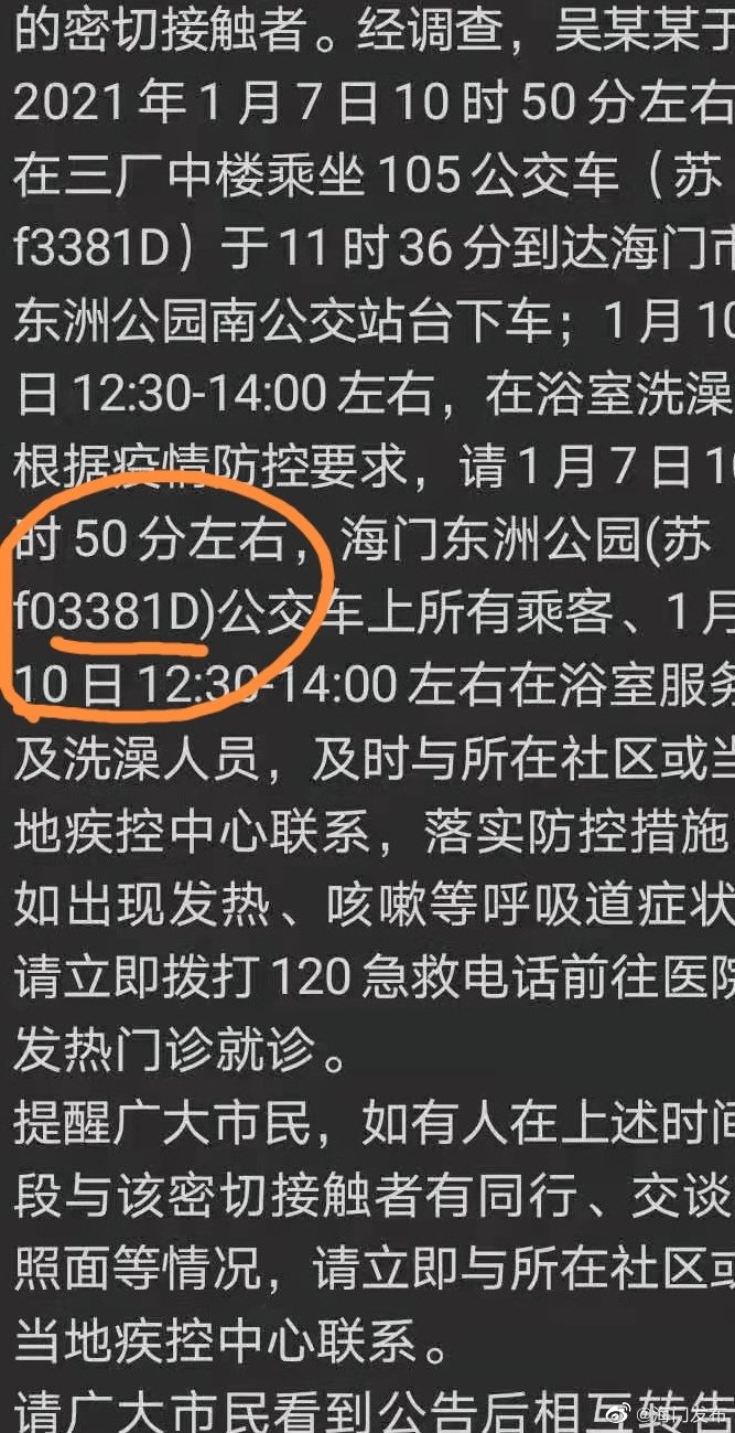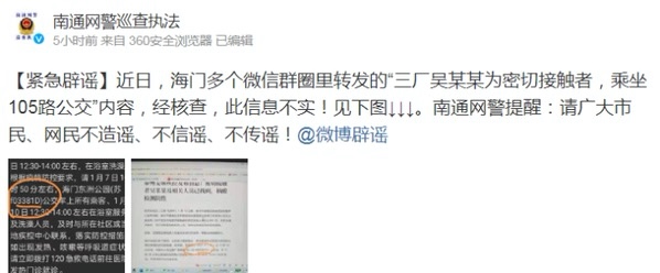 今天(16日),“南通网警巡查执法”微博发布一则紧急辟谣:近日,海门多个微信群圈里转发的“三厂吴某某为密切接触者,乘坐105路公交”内容,经核查,此信息不实!