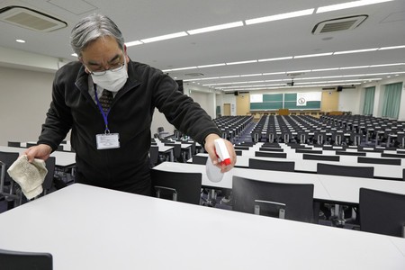 考场工作人员正在进行消毒(时事通信社)
