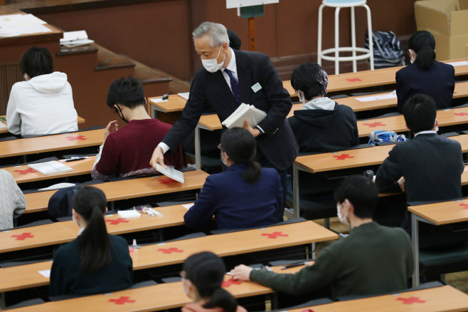 佩戴口罩参加考试的日本考生(时事通信社)