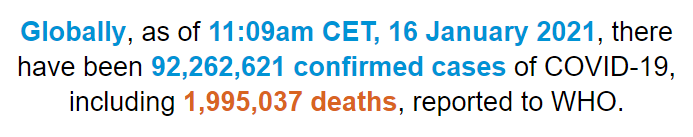 根据世卫组织最新实时统计数据,截至欧洲中部时间1月16日11时09分(北京时间1月16日18时09分),全球累计新冠肺炎确诊病例92262621例,累计死亡病例1995037例。(总台记者 朱赫)