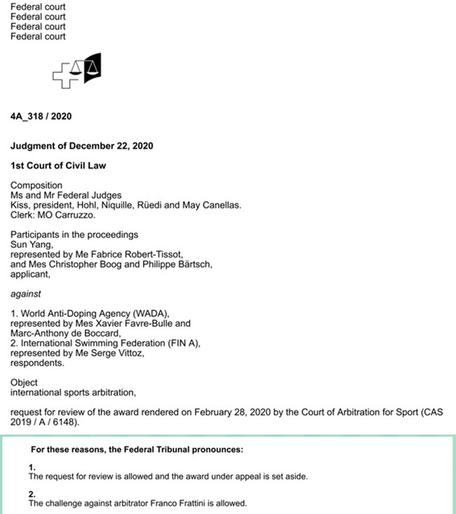 瑞士高院在裁决书中指出,判定仲裁员独立和公正性原则应参照法官应遵守的相关规定,参考标准可以是欧洲、瑞士相关法律以及国际律师协会的利益冲突规则。因此,孙杨的举证和质疑理由成立,弗拉蒂尼存在种族歧视偏见,所以支持孙杨诉请,此案重审,撤销CAS有争议的裁决结果。