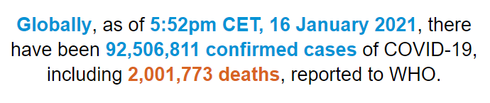 根据世卫组织最新实时统计数据,截至欧洲中部时间1月16日17时52分(北京时间1月17日0时52分),全球累计新冠肺炎确诊病例92506811例,累计死亡病例2001773例。16日全球新冠肺炎确诊病例新增688015例,死亡病例新增14718例。(总台记者 朱赫)