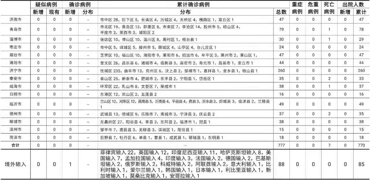 山东1月16日0时至24时:无新增本地疑似病例、确诊病例。累计报告确诊病例777例,死亡7例,治愈出院770例。