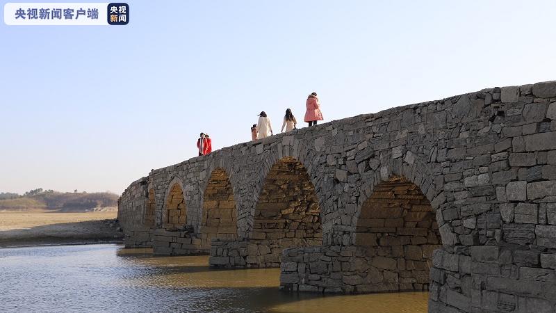 入冬以来,中国最大淡水湖鄱阳湖进入枯水期。位于江西省九江市湖口县双钟镇鄱阳湖底的五眼石拱古桥现身鄱阳湖底。