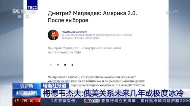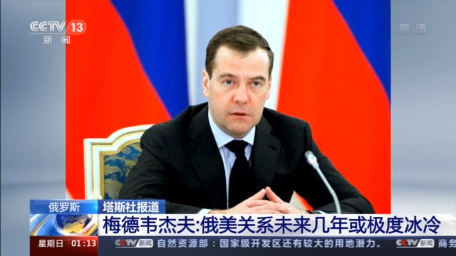 塔斯社16日发表了对俄罗斯联邦安全会议副主席梅德韦杰夫的采访。梅德韦杰夫表示,美国新一届政府可能保持对俄敌对政策,预计俄美关系未来几年可能极度冰冷。