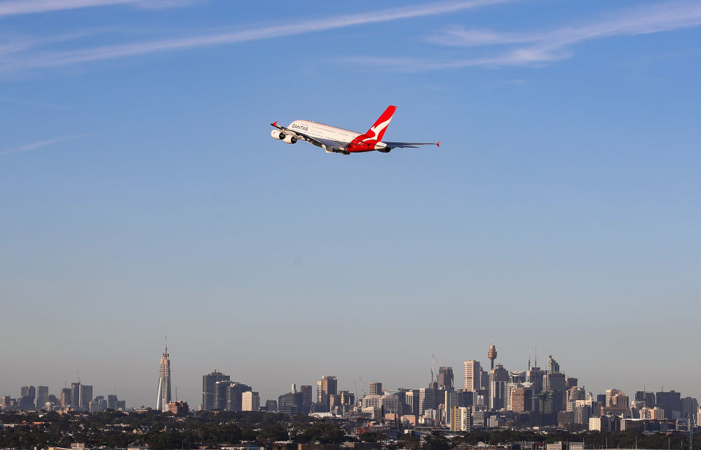 2020年3月18日,一架澳航客机飞过澳大利亚悉尼城区。澳大利亚最大航空公司澳洲航空集团2020年6月18日宣布,由于澳大利亚边界将继续关闭,澳航大多数国际航班将停飞到当年10月底。(新华社记者 白雪飞摄)