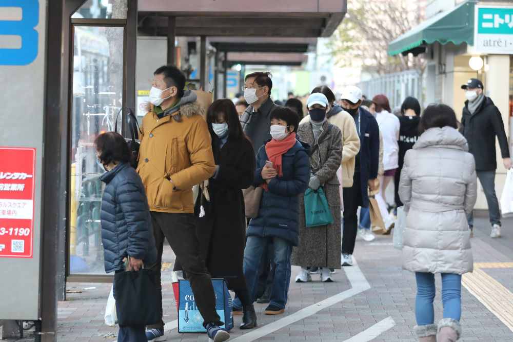 2020年12月31日,在日本东京,人们戴口罩等候公交车。(新华社记者杜潇逸摄)