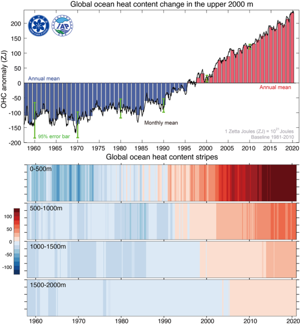 全球变暖90%以上的热量被海洋吸收,海洋热含量成为判断全球是否变暖的最佳指标之一。最新数据表明,与2019年相比,在2020年,全球海洋上层2000米吸收的热量增加了2×1022焦耳,这些热量可以使13亿个1.5升的电热水壶的水同时烧开;过去80年中,海洋每一个十年都比前十年更暖;海洋变暖也使强台风、飓风和极端降雨增多。此外,海洋层结的加强还会抑制海洋垂向热量交换和溶解氧输送,进一步导致全球气温上升,并影响海洋生态系统的健康。