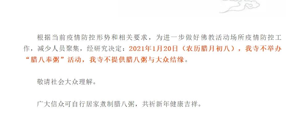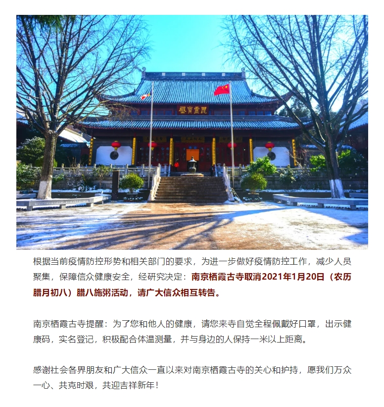 南京鸡鸣寺、南京栖霞寺取消2021年1月20日(农历腊月初八)腊八施粥活动。