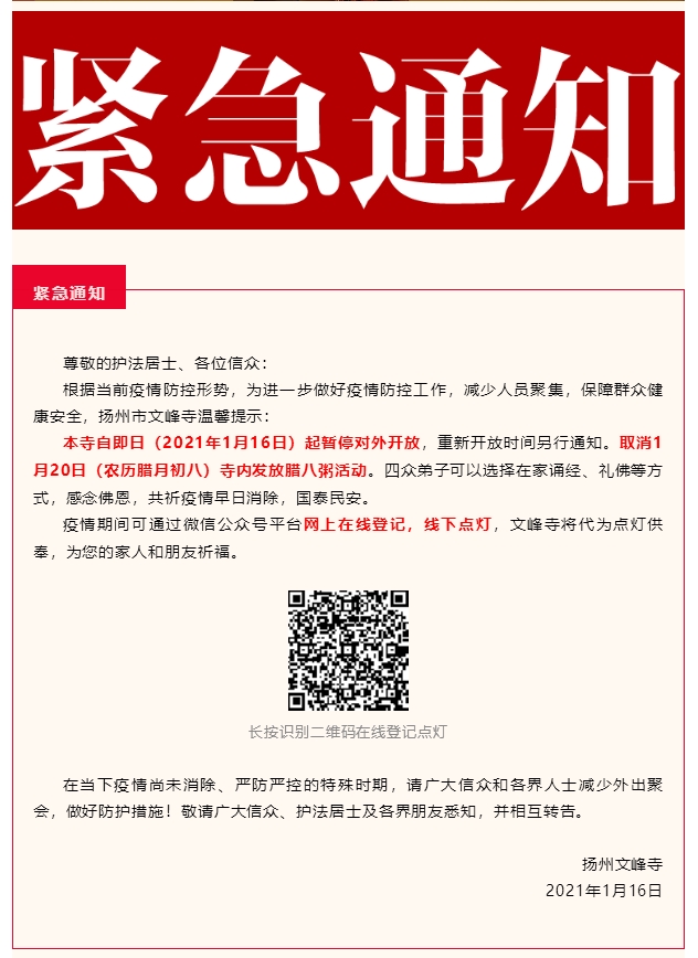 扬州文峰寺发布紧急通知,16日起暂停开放,重新开放时间另行通知。取消1月20日(农历腊月初八)寺内发放腊八粥活动。
