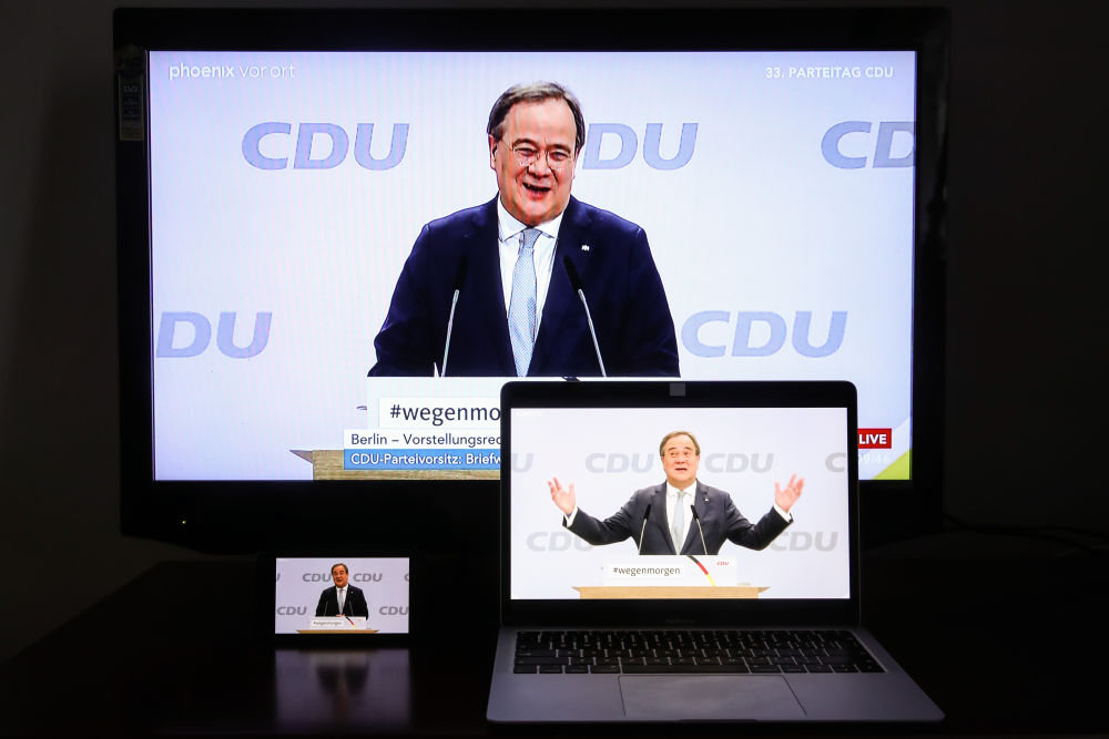 这是1月16日在德国柏林拍摄的基督教民主联盟(基民盟)当选主席阿明·拉舍特在基民盟线上党代会上讲话的视频画面。(新华社记者单宇琦摄)