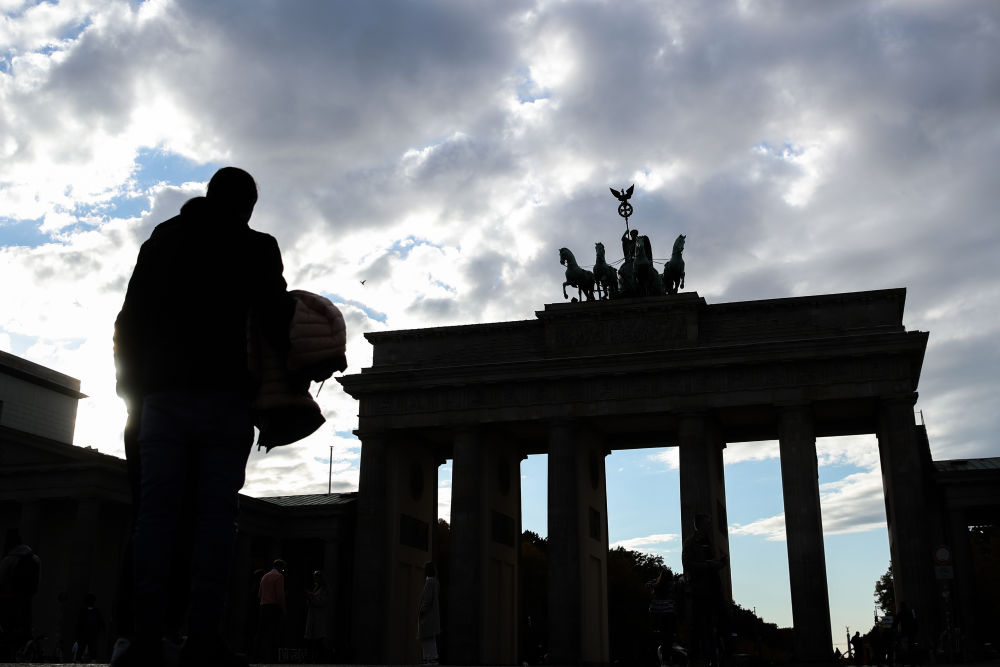 2020年10月22日,一名游客站在德国柏林勃兰登堡门前。(新华社记者单宇琦摄)