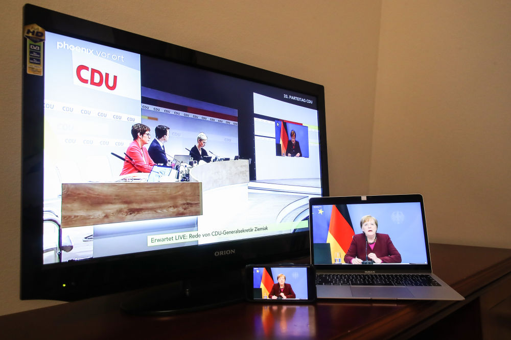 这是1月15日在德国柏林拍摄的德国总理默克尔(右)在基督教民主联盟(基民盟)线上党代会致辞的视频画面。(新华社记者单宇琦摄)