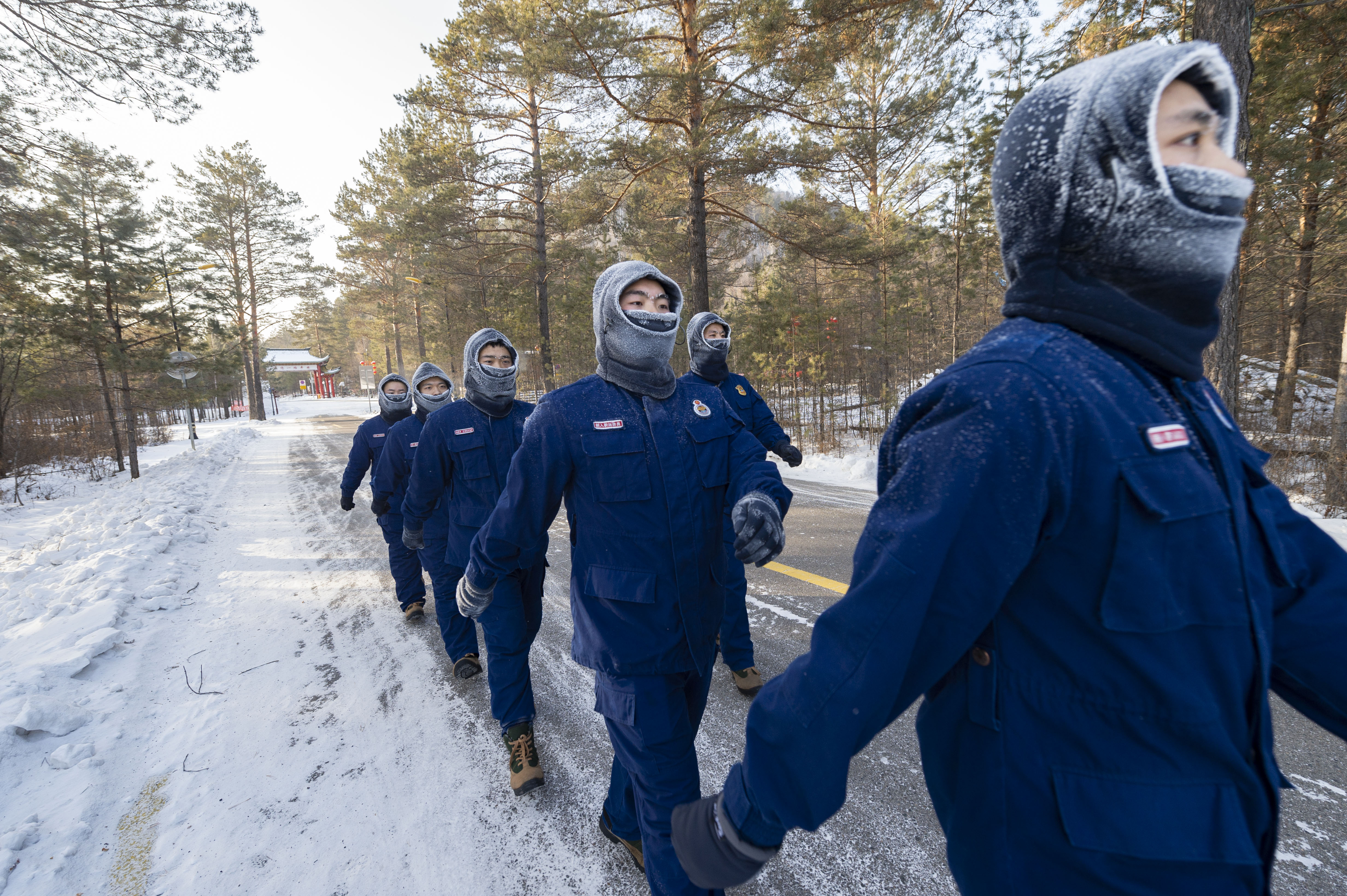 中国最北的消防救援站——漠河市北极村消防救援站的消防员们在进行室外耐寒训练。新华社记者 谢剑飞 摄