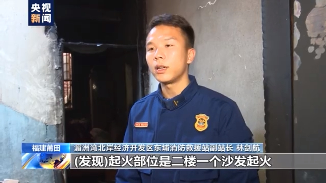 湄洲湾北岸经济开发区东埔消防救援站副站长 林剑航:我们进入火场之后(发现)起火部位是二楼一个沙发起火,另外火势已经蔓延到三楼, 一直沿着这个楼梯,居民堆放的一些可燃物,一直往上蔓延。我们先出一支水枪,对搜救组进行掩护,强攻进入被困人员的所在房间。