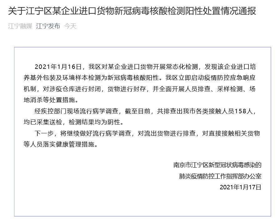 据江苏南京“江宁发布”消息,2021年1月16日,南京市江宁区对某企业进口货物开展常态化检测,发现该企业进口培养基外包装及环境样本检测为新冠病毒核酸阳性。江宁区立即启动疫情防控应急响应机制,对涉疫仓库进行封闭,货物进行封存,并全面开展人员排查、采样检测、场地消杀等处置措施。