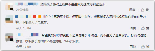 然而,也有网友指出,电竞劝退无法解决青少年沉迷游戏问题,希望不是为了迎合家长,打着劝退的旗号“额外”收费。