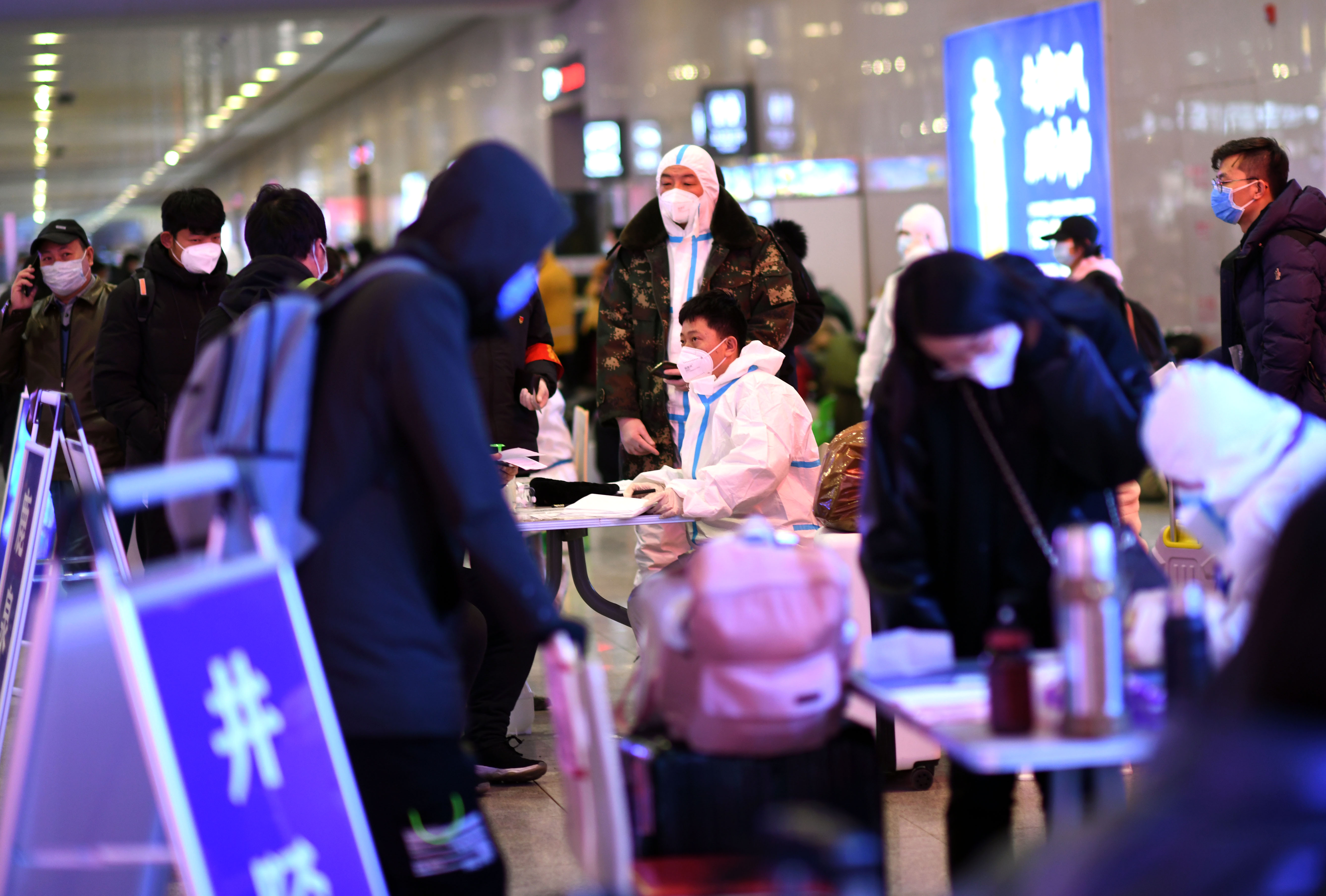 1月17日,工作人员在石家庄火车站为返乡人员登记信息。