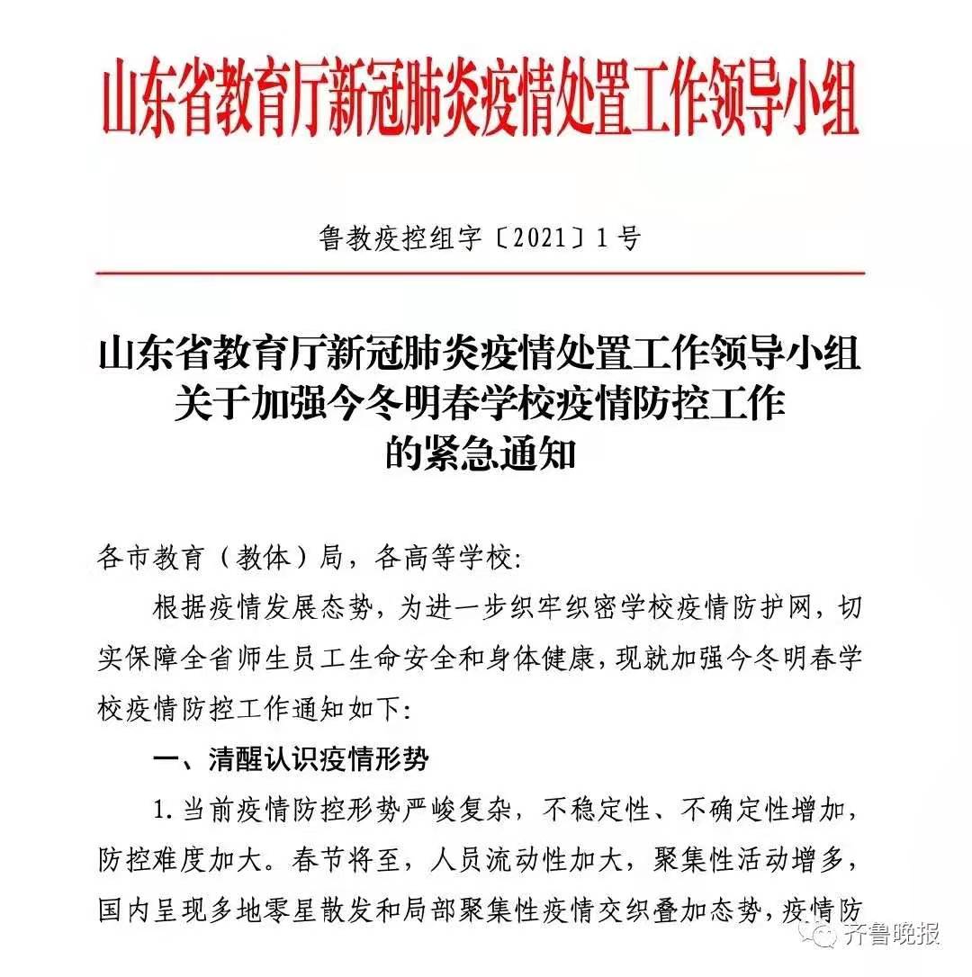 近日,山东省教育厅发布《关于加强今冬明春学校疫情防控力量工作的紧急通知》。通知全文如下: