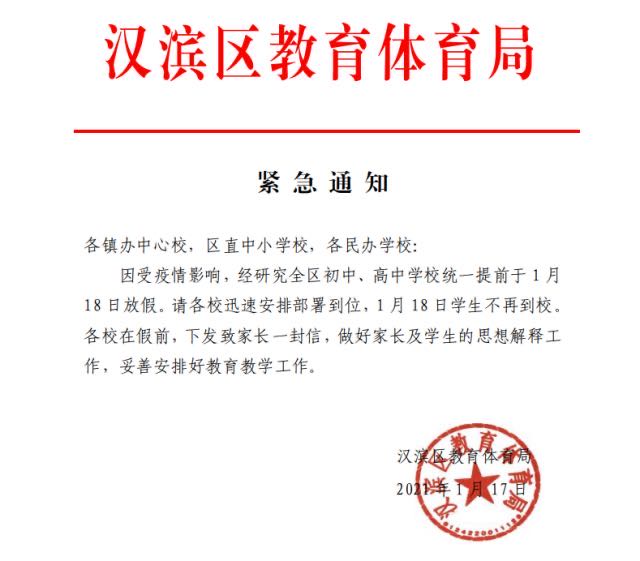 1月17日,陕西省安康市汉滨区教育体育局发布紧急通知:受疫情影响,经研究全区初中、高中学校统一提前于1月18日放假。请各校迅速安排部署到位,1月18日学生不再到校。各校在假前,下发致家长一封信,做好家长及学生的思想解释工作,妥善安排好教育教学工作。(总台央视记者 杨永青)