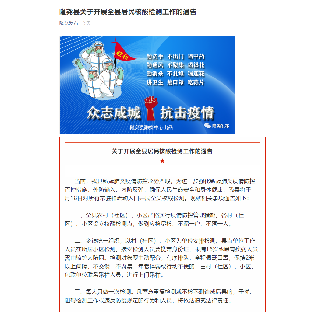 据“隆尧发布”微信公众号消息,1月17日,隆尧县应对新冠肺炎疫情工作领导小组发布通告,开展隆尧全县居民核酸检测工作,具体内容如下: