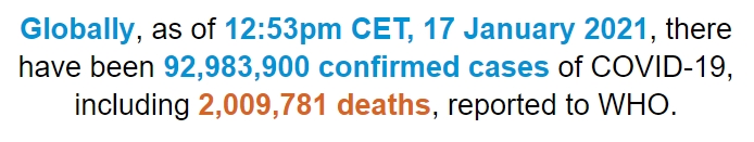 根据世卫组织最新实时统计数据,截至欧洲中部时间1月17日12时53分(北京时间1月17日19时53分),全球累计新冠肺炎确诊病例92983900例,累计死亡病例2009781例。