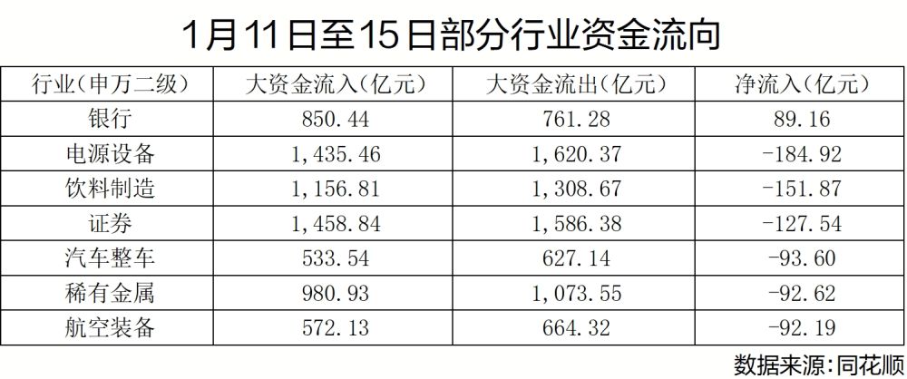 同花顺数据显示,在过去的5个交易日内,累计共有184亿大资金从电源设备板块撤离,151亿资金从饮料制造板块撤离,超90亿元资金分别从汽车整车、稀有金属和航空装备撤离。而银行板块则获得了“断崖式”的89亿元净流入,相比排名净流入第二位的通信运营高出20倍。北向资金方面,1月15日的沪股通、深股通十大成交榜上,贵州茅台、五粮液和隆基股份净流出分别为5.51亿元、4.51亿元和1.63亿元,而招商银行、兴业银行和平安银行则分别获得北向流入12.87亿元,1.52亿元和1.19亿元。