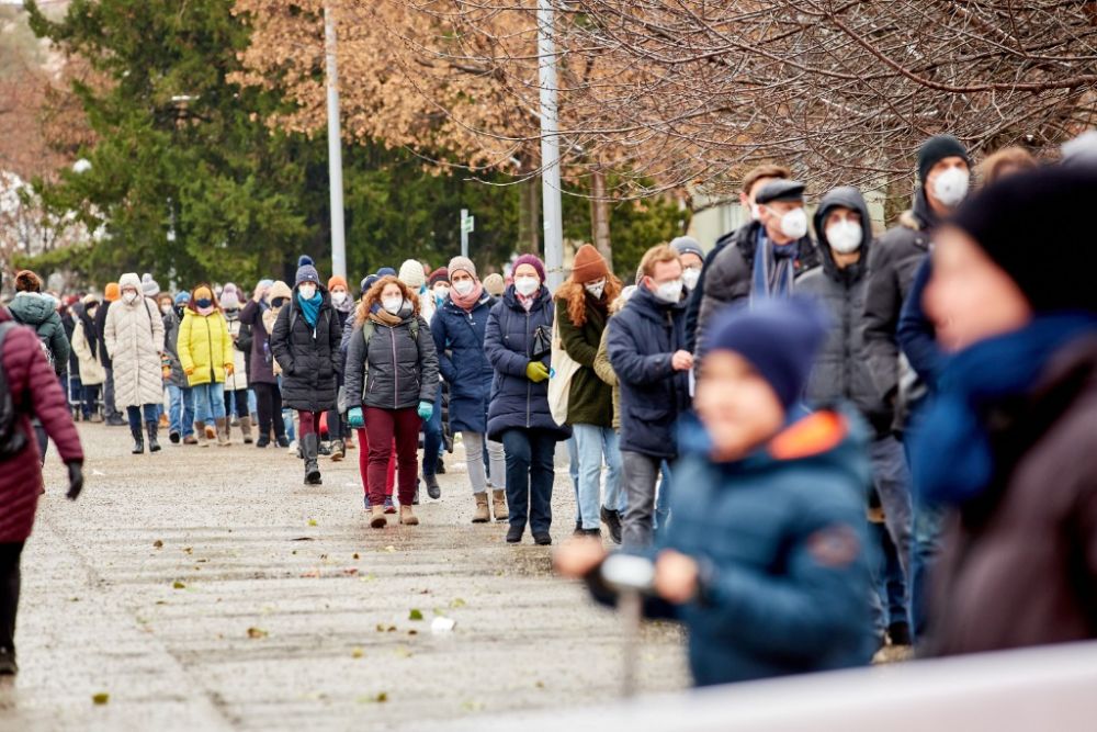 2020年12月4日,人们在奥地利首都维也纳体育馆排队等待接受新冠病毒检测。(新华社发,乔治斯·施耐德摄)