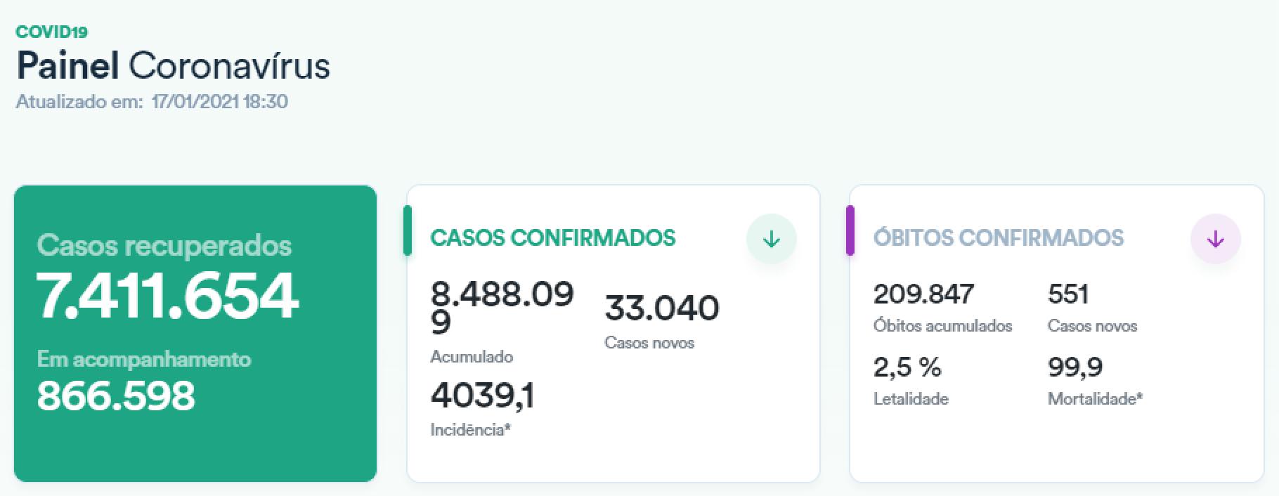 截至当地时间1月17日,据巴西卫生部发布的数据,巴西单日新增新冠肺炎确诊病例33040例,累计确诊8488099例;新增死亡病例551例,累计死亡209847例;累计康复7411654例。