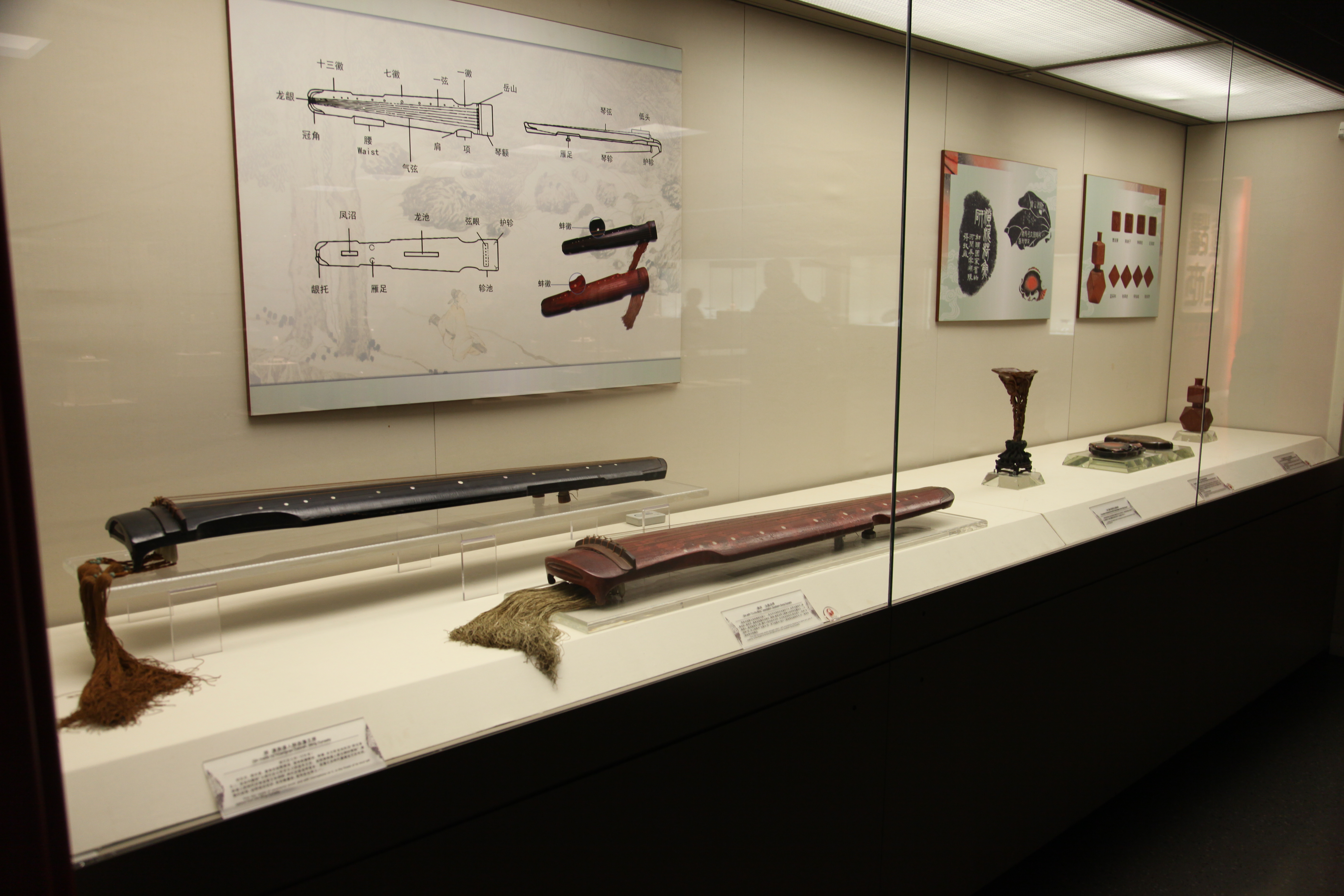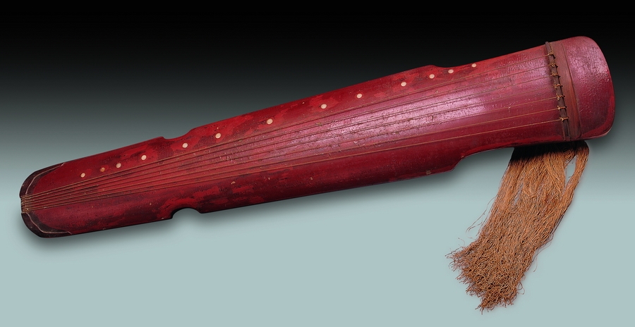 古琴造型优美,常见的有圣人琴、文人琴、帝王琴。“这张琴是圣人琴中典型的神农式,鹿角灰胎,髹朱漆,十三蚌徽。鹿角灰是鹿角烧成的白色粉末,透气性好,漆面磨过以后,点点鹿角灰藏藏露露,闪闪烁烁,十分耐看。”天津博物馆金牌讲解员杨旭说。