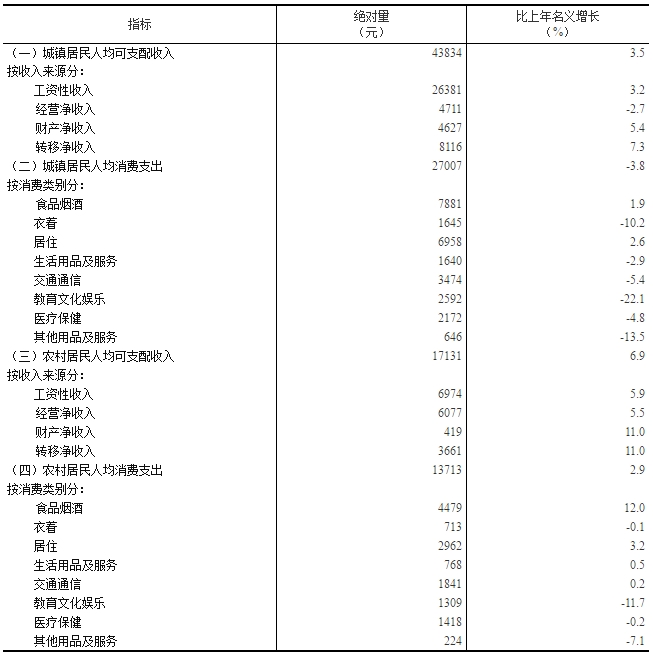 2020年,全国居民人均可支配收入32189元,比上年名义增长4.7%,扣除价格因素,实际增长2.1%。其中,城镇居民人均可支配收入43834元,增长(以下如无特别说明,均为同比名义增速)3.5%,扣除价格因素,实际增长1.2%;农村居民人均可支配收入17131元,增长6.9%,扣除价格因素,实际增长3.8%。