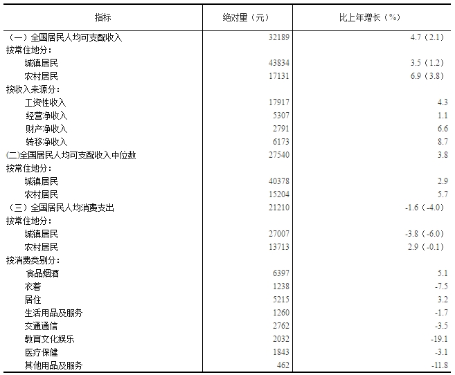 表1 2020年全国居民收支主要数据