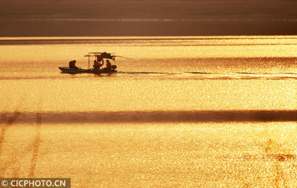 ↑2021年1月15日,一只保洁船行驶在安徽省六安市淠河水面上。CICPHOTO/郑金强 摄