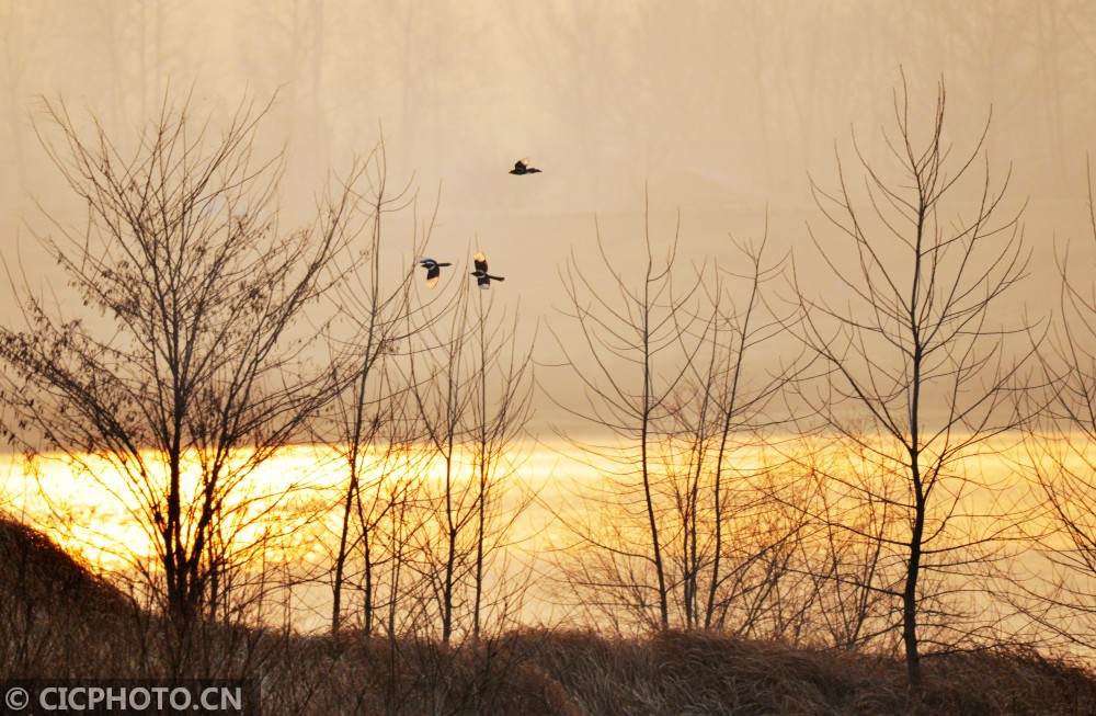 ↑2021年1月15日,几只鸟儿在安徽省六安市淠河上空飞舞。CICPHOTO/郑金强 摄