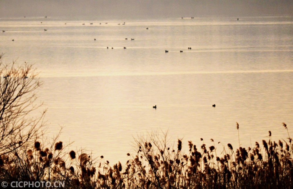 ↑2021年1月15日,一群水鸟在安徽省六安市淠河水面上畅游。CICPHOTO/郑金强 摄