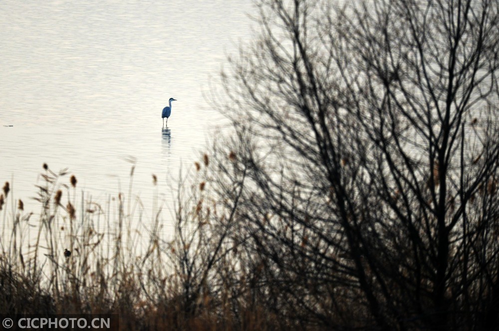 ↑2021年1月15日,一只苍鹭在安徽省六安市淠河水面上觅食。CICPHOTO/郑金强 摄