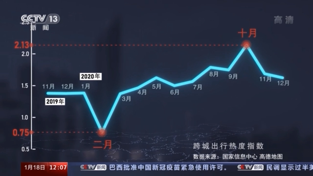 国家信息中心根据用户出行的位置变化信息,测算出了这张反映人们跨城出行热度的曲线,经历了2月的“低谷”,一路上扬,在10月,迎来最高点。