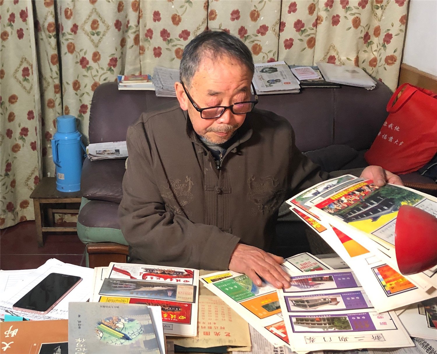 杨敏志在整理自己收藏的遵义会议会址门票(2021年1月11日摄)。新华社记者 李惊亚 摄